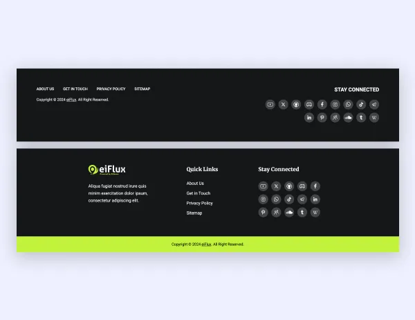 Tersedia dua style footer yang mudah disesuaikan. Tampilkan informasi penting seperti tautan, kontak, atau hak cipta dengan elegan tanpa mengurangi estetika website.